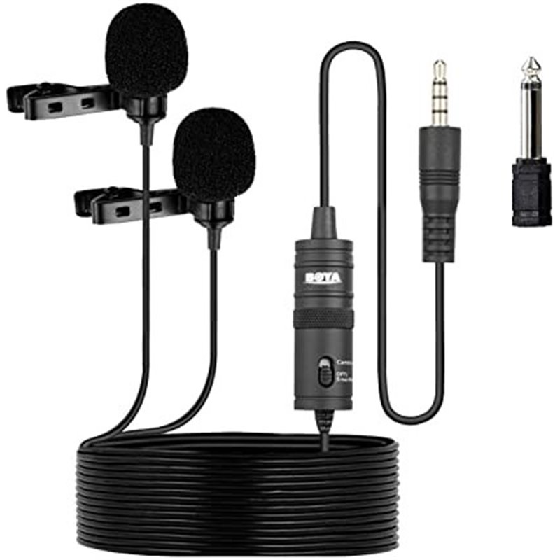 Micrófono Boya con un transmisor, receptor, un micrófono lavalier y dos cables, minijack 3.5mm y XLR