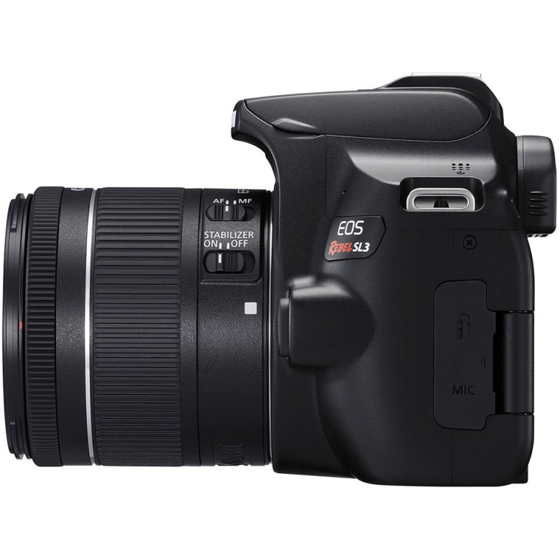 Defined by its notably sleek form factor, the black Canon EOS Rebel SL3 is a versatile DSLR offering an ideal mix of stills and video capabilities. Featuring a 24.1MP APS-C-format CMOS sensor and DIGIC 8 image processor, high-resolution stills and UHD 4K video recording are possible, along with a wide ISO 100-25600 sensitivity range to suit working in a variety of lighting conditions. In-camera 4K time-lapse movie creation is also possible for creatively depicting subjects over time. Benefitting the imaging attributes, the sensor's design also facilitates Dual Pixel CMOS AF, which uses phase-detection autofocus for quick, accurate, and smooth focusing performance when recording movies or shooting stills in live view. When shooting stills using the optical viewfinder, a 9-point phase-detection system is used for quick and accurate focusing in a variety of shooting scenarios.